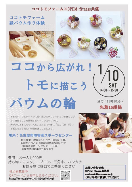 2026年1月10日ココトモファームさんと共催でココトモファーム縁バウム作り体験をおこないます。場所と時間は左のチラシをご覧ください。先着15組です。チラシのQRからお申し込みできます。