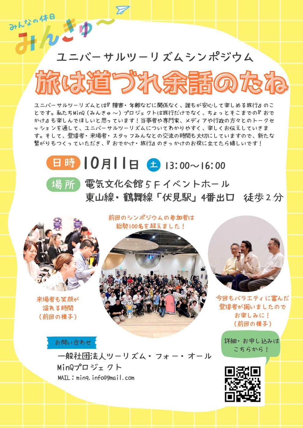 一般社団法人ツーリズム・フォー・オール&MinQプロジェクトが10月11日にユニバーサルツーリズムシンポジウムを開催します。参加を希望される方はポスターのQRコードからお申し込みください。 The Tourism for All & MinQ Project will be holding a Universal Tourism Symposium on October 11th. If you would like to attend, please apply using the QR code on the poster.